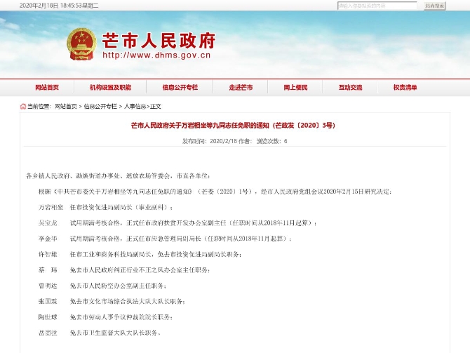 根據(jù)《中共芒市委關(guān)于萬(wàn)巖相坐等九同志任免職的通知》(芒委〔2020〕1號(hào)),經(jīng)市人民政府黨組會(huì)議2020年2月15日研究決定: