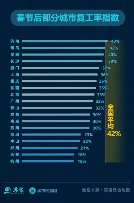 截至2月14日,全國(guó)平均復(fù)工率約為42%,云南、湖南、貴州、西藏等地的復(fù)工率指數(shù)較高,約為70%。江蘇規(guī)上企業(yè)復(fù)工率居全國(guó)首位。但近期全國(guó)遷入人數(shù)較多的北京、上海、廣州、深圳、成都五座城市,復(fù)工率均不足40%。據(jù)新華視點(diǎn)報(bào)道,相當(dāng)多生產(chǎn)企業(yè)的實(shí)際復(fù)工率在30%至40%。一些企業(yè)負(fù)責(zé)人認(rèn)為,未來(lái)一周,第二產(chǎn)業(yè)全面復(fù)工難度較高,到2月底,有效復(fù)工可望達(dá)80%。