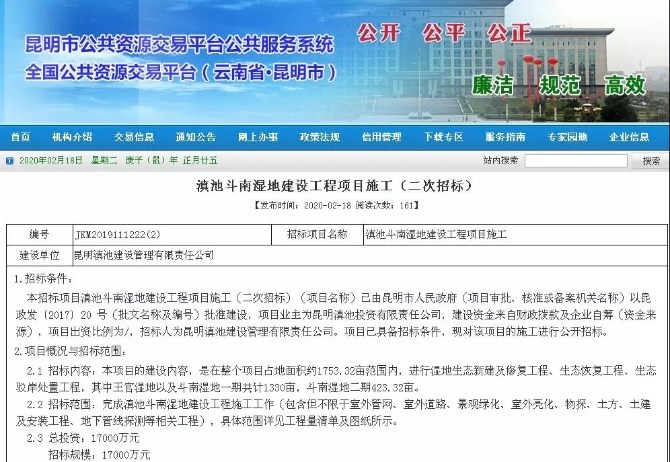 昆明信息港訊 (昆明日報(bào) 全媒體記者孫瑩) 2月18日,昆明市公共資源交易平臺(tái)發(fā)布了《滇池斗南濕地建設(shè)工程項(xiàng)目施工(二次招標(biāo))》,公告稱,將投資17000萬元,歷時(shí)180天完成對王官濕地以及斗南濕地一期、二期的濕地生態(tài)新建及修復(fù)工程。