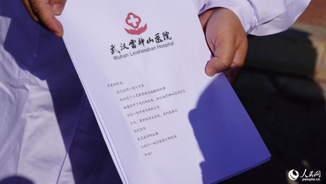 36歲的王先生與袁婆婆同天康復(fù)出院。在醫(yī)院門口,王先生接過雷神山醫(yī)院副院長袁玉峰遞來的出院證明和慰問信,自己大聲朗誦慰問信中的內(nèi)容。