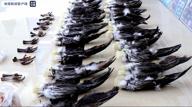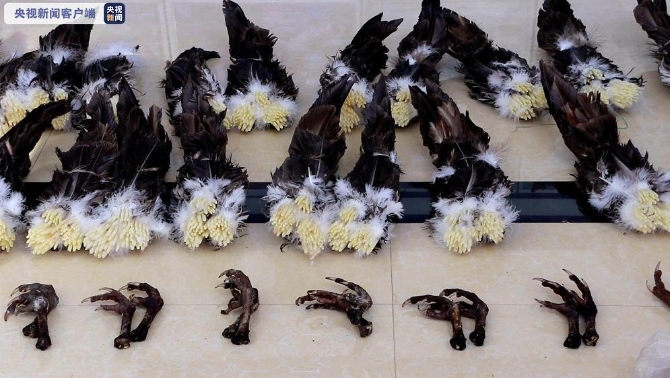 疫情當(dāng)前,云南森林公安堅(jiān)持打控結(jié)合,全力做好野生動(dòng)物源頭防控,對(duì)涉野違法犯罪行為重拳打擊。云南施甸縣森林公安局18日通報(bào),日前,該局成功破獲一起特大非法獵捕、殺害珍貴瀕危野生動(dòng)物案,抓獲犯罪嫌疑人1名?,F(xiàn)場(chǎng)查獲國(guó)家一級(jí)、二級(jí)重點(diǎn)保護(hù)野生動(dòng)物金雕、高山兀鷲等27只,爪子、羽毛、肉等動(dòng)物制品鋪滿一地,令人觸目驚心。