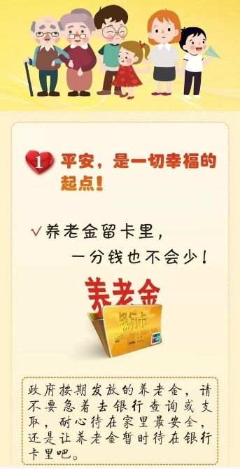 多地人社部門提醒退休人員,當前正值抗擊新型冠狀病毒感染肺炎的關鍵階段,建議盡量通過手機銀行APP、銀行微信公眾號等途徑查詢到賬信息,不外出,不聚集,避免集中到銀行。