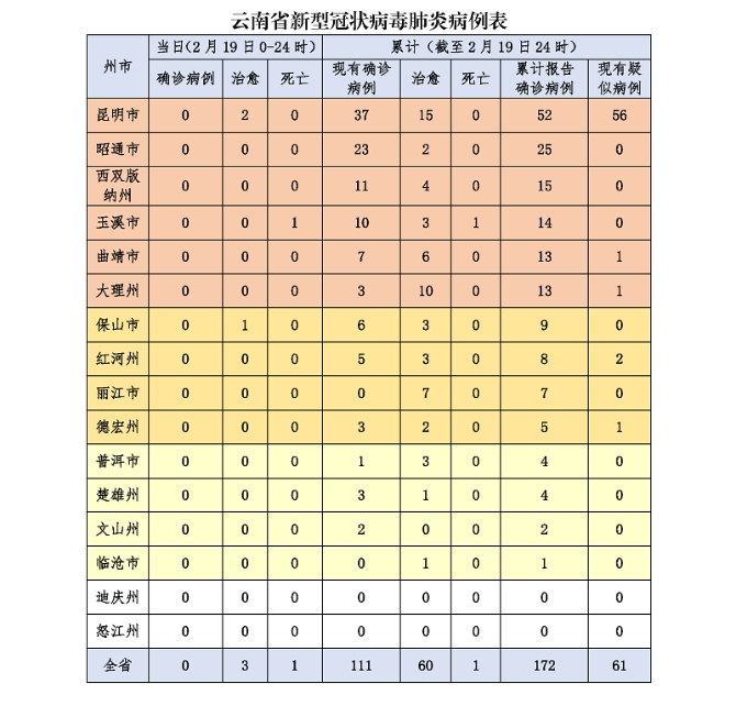 昆明信息港訊 機(jī)器人小明 2月19日12時(shí)至24時(shí),無(wú)新增確診病例。截至2月19日24時(shí),全省累計(jì)確診病例172例(昆明市核減1例),治愈出院60例,死亡1例,現(xiàn)有確診病例111例,其中危重癥2例,重癥9例。