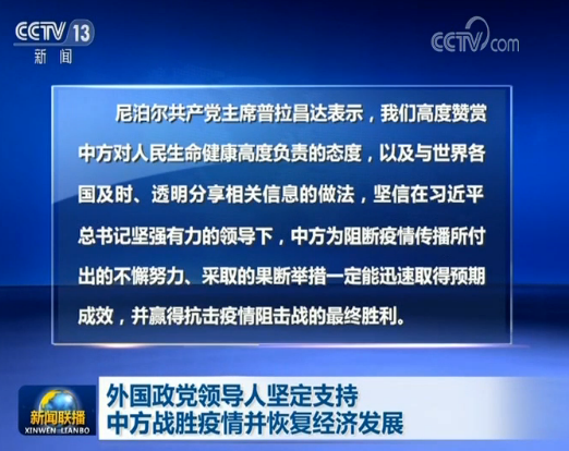尼泊爾共產(chǎn)黨主席普拉昌達(dá)表示,我們高度贊賞中方對(duì)人民生命健康高度負(fù)責(zé)的態(tài)度,以及與世界各國(guó)及時(shí)、透明分享相關(guān)信息的做法,堅(jiān)信在習(xí)近平總書(shū)記堅(jiān)強(qiáng)有力的領(lǐng)導(dǎo)下,中方為阻斷疫情傳播所付出的不懈努力、采取的果斷舉措一定能迅速取得預(yù)期成效,并贏得抗擊疫情阻擊戰(zhàn)的最終勝利。