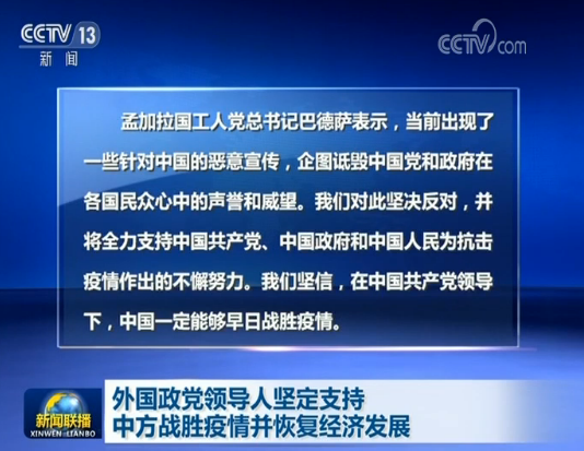 孟加拉國(guó)工人黨總書(shū)記巴德薩表示,當(dāng)前出現(xiàn)了一些針對(duì)中國(guó)的惡意宣傳,企圖詆毀中國(guó)黨和政府在各國(guó)民眾心中的聲譽(yù)和威望。我們對(duì)此堅(jiān)決反對(duì),并將全力支持中國(guó)共產(chǎn)黨、中國(guó)政府和中國(guó)人民為抗擊疫情作出的不懈努力。我們堅(jiān)信,在中國(guó)共產(chǎn)黨領(lǐng)導(dǎo)下,中國(guó)一定能夠早日戰(zhàn)勝疫情。