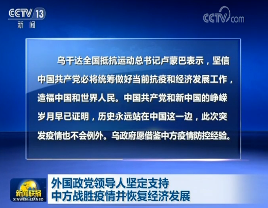 烏干達(dá)全國(guó)抵抗運(yùn)動(dòng)總書(shū)記盧蒙巴表示,堅(jiān)信中國(guó)共產(chǎn)黨必將統(tǒng)籌做好當(dāng)前抗疫和經(jīng)濟(jì)發(fā)展工作,造福中國(guó)和世界人民。中國(guó)共產(chǎn)黨和新中國(guó)的崢嶸歲月早已證明,歷史永遠(yuǎn)站在中國(guó)這一邊,此次突發(fā)疫情也不會(huì)例外。烏政府愿借鑒中方疫情防控經(jīng)驗(yàn)。