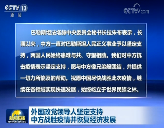 巴勒斯坦法塔赫中央委員會(huì)秘書(shū)長(zhǎng)拉朱布表示,長(zhǎng)期以來(lái),中方一直對(duì)巴勒斯坦人民正義事業(yè)予以堅(jiān)定支持,兩國(guó)人民始終患難與共、守望相助。我們對(duì)中方抗擊疫情表示堅(jiān)定支持,愿與中方像兄弟般團(tuán)結(jié),并提供一切力所能及的幫助。祝愿中國(guó)盡快戰(zhàn)勝此次疫情,繼續(xù)在各領(lǐng)域?qū)崿F(xiàn)快速發(fā)展,始終屹立于世界民族之林。