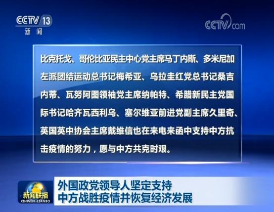 近日,又有一些國(guó)家政黨領(lǐng)導(dǎo)人致電致函中共中央對(duì)外聯(lián)絡(luò)部,積極評(píng)價(jià)中方抗擊新冠肺炎疫情工作取得的新進(jìn)展,堅(jiān)信中方將戰(zhàn)勝疫情,并迅速恢復(fù)經(jīng)濟(jì)發(fā)展。