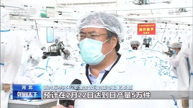 新興際華3502職業(yè)裝公司黨委書記 周長(zhǎng)勝:目前的日產(chǎn)量達(dá)到了4.4萬(wàn)件,預(yù)計(jì)在2月22日達(dá)到日產(chǎn)量5萬(wàn)件。