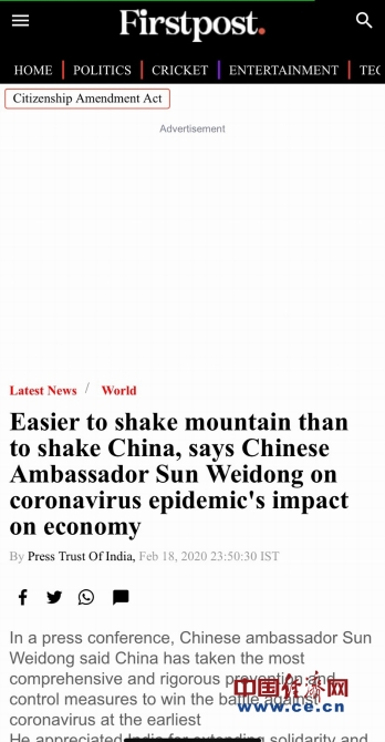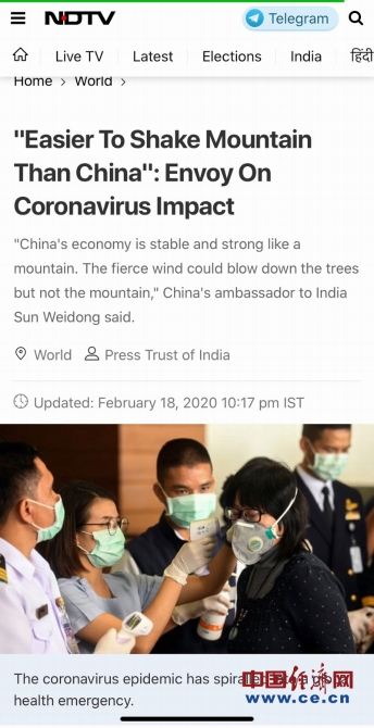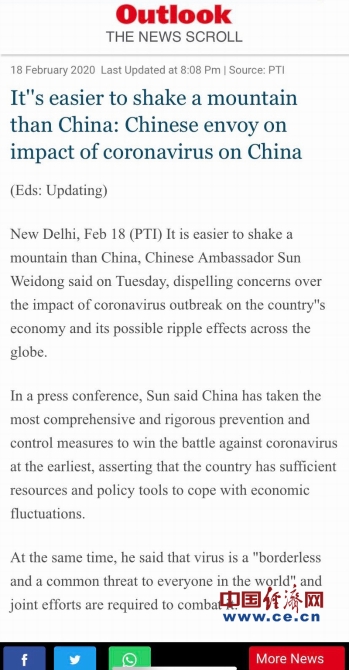 2月18日,中國駐印度使館在新德里舉辦新冠肺炎疫情防控的媒體吹風(fēng)會,駐印大使孫衛(wèi)東在吹風(fēng)會上以三個關(guān)鍵詞信心(Confidence)、真情(Compassion)和合作(Cooperation)為主線,強調(diào)中國必將打贏疫情防控阻擊戰(zhàn)。孫大使說,疫情爆發(fā)以來,包括印度朋友在內(nèi)的很多外國友人都在為武漢加油,為中國加油。我們感謝大家,也有必勝信心。信心來自于中國共產(chǎn)黨的強大領(lǐng)導(dǎo)力(Strong Leadership),來自于中國集中力量辦大事的強大行動力(Strong Actions),來自于堅韌不拔、勇于犧牲的中國人民(Strong People),來自于中國雄厚的經(jīng)濟(jì)實力(Strong Economy)。我們也完全有信心保持中國經(jīng)濟(jì)的長期穩(wěn)定發(fā)展。撼山易,撼中國難。