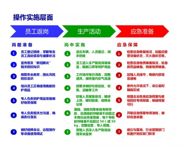 企業(yè)應(yīng)周密制定“一企一策”復(fù)工方案,在制度和操作兩個層面,從員工生活和生產(chǎn)活動等方面明確管控要求并采取有針對性的管控措施,同時做好特殊時期的應(yīng)急準(zhǔn)備。管控重點提示如下: