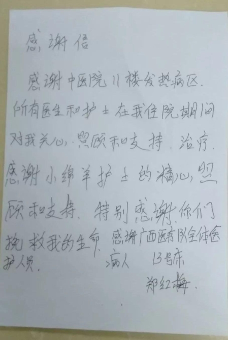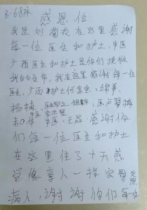 截至2月19日,廣西首批支援湖北抗疫醫(yī)療隊,累計收治病人數(shù)為260例,其中重型人數(shù)77例,危重癥人數(shù)43例,已治愈出院人數(shù)41例。病人寫的感謝信接踵而至,他們發(fā)自肺腑感謝醫(yī)護人員的悉心照顧。
