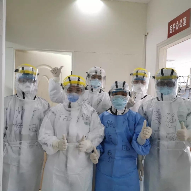 廣西首批支援湖北抗疫醫(yī)療隊來黃陂區(qū)中醫(yī)醫(yī)院已經(jīng)有二十幾天了,無論是病人還是醫(yī)護人員,大家就像一個大家庭,彼此相親相愛。雖然醫(yī)護團隊都穿著密不透風的防護服,戴著嚴實的口罩,厚厚的護目鏡和重重的防護面屏,大家都看不清對方的面容,但是只要一個堅定的眼神,一聲動人的鼓勵,就無所畏懼。 ?