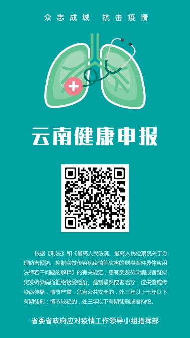 根據(jù)《云南省應(yīng)對新冠肺炎疫情分區(qū)分級防控的實施意見》(云南省應(yīng)對疫情領(lǐng)導(dǎo)小組指揮部第10號通告)要求,所有入滇人員須申報個人健康狀況。為此,自2020年2月22日起,全面啟動“云南健康申報”系統(tǒng)。