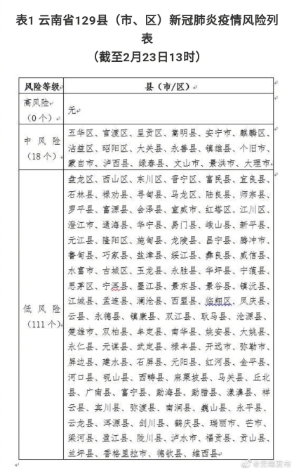 昆明信息港訊 機(jī)器人小明 2月23日,云南省衛(wèi)生健康委員會(huì)發(fā)布了調(diào)整后的云南省129個(gè)縣(市、區(qū))新冠肺炎疫情風(fēng)險(xiǎn)列表。