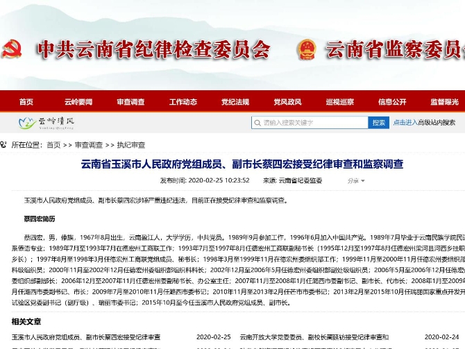 昆明信息港訊 機器人小明 玉溪市人民政府黨組成員、副市長蔡四宏涉嫌嚴(yán)重違紀(jì)違法,目前正在接受紀(jì)律審查和監(jiān)察調(diào)查。