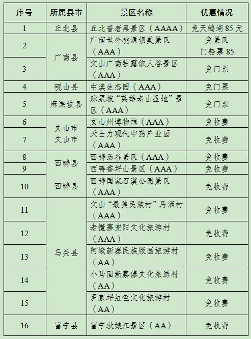優(yōu)免政策:本人享受在文山州內(nèi)3日住宿、交通、景區(qū)游覽項目全免費,其隨同親屬享受五折優(yōu)惠措施。