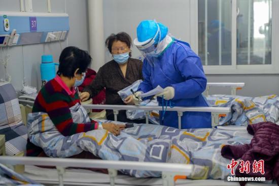 武漢火神山醫(yī)院感染二科一病區(qū)的隔離病房內(nèi)護(hù)士長胡晶為患者進(jìn)行身體檢查。中新社記者 張暢 攝