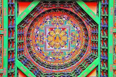 天花彩畫常見的有“片金龍?zhí)旎ā?(僅限于王府)“作染團(tuán)鶴天花”“攢退活圖案天花”“作染百花圖天花”等。天安門城樓內(nèi)部古色古香,大殿內(nèi)藻井天花畫的是團(tuán)龍圖案;故宮樂壽堂木雕天花,是用楠木本色雕刻的卷草圖案,富麗雅致。位于北河沿大街的嵩祝寺天花彩畫也很有特色,鑲嵌著“六字真言”。嵩祝寺藏經(jīng)樓是一處彩畫舊跡集中的建筑,兩稍間的天花和梁檁枋彩畫至今保存良好。六字真言天花(亦稱六字正言天花),源于藏傳佛教名詞,是明、清兩代佛教建筑天花較普遍采用的裝飾題材。六字真言天花在畫法上、做法上有多種樣式,在功能上除了裝飾作用,還便于信徒循環(huán)誦讀。