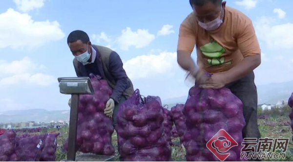 施甸縣仁和鎮(zhèn)洋蔥種植基地里,工人戴著口罩正忙著給洋蔥過(guò)稱(chēng)。資料圖