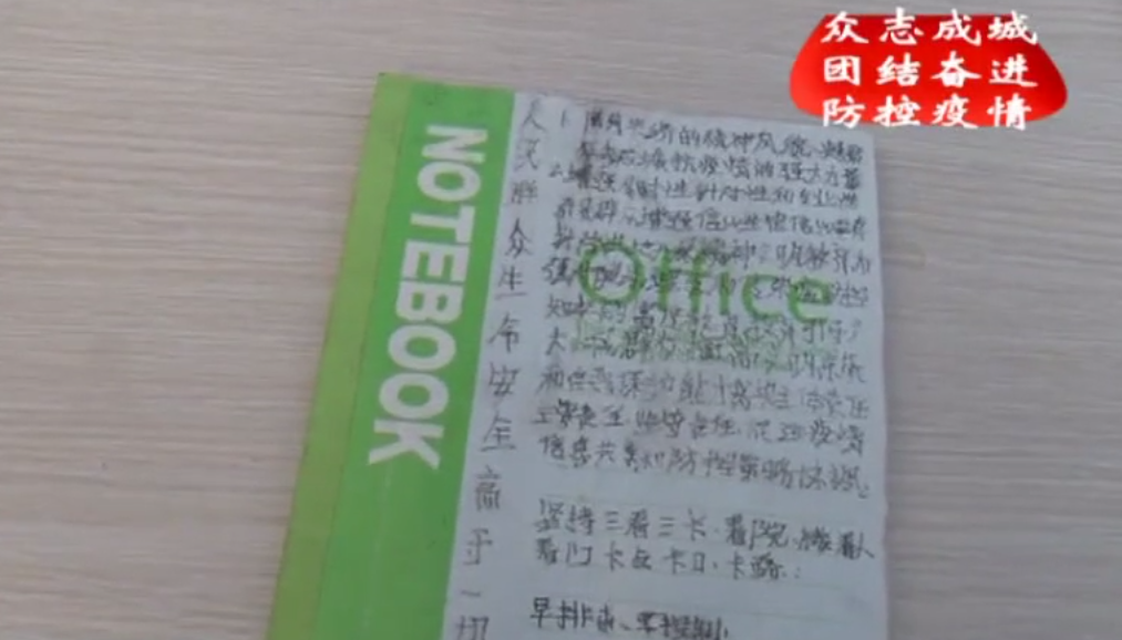 這本工作日記上,記錄著正月初二至今石壩村疫情防控檢查點(diǎn)每天的工作,雖然字寫(xiě)得歪歪扭扭,每天那個(gè)村民進(jìn)出,什么時(shí)間,去干什么,都記錄得清清楚楚。這些文字是石壩村黨支部書(shū)記楊光明記錄的。