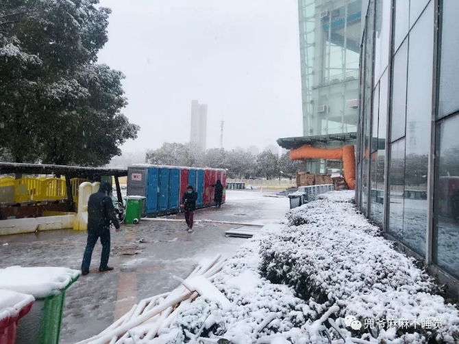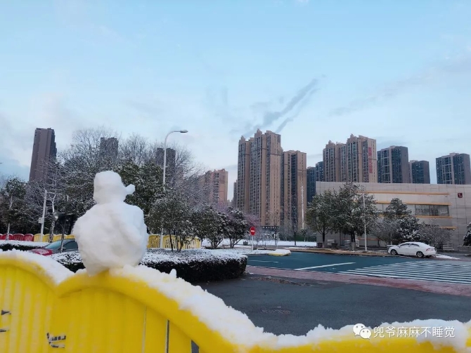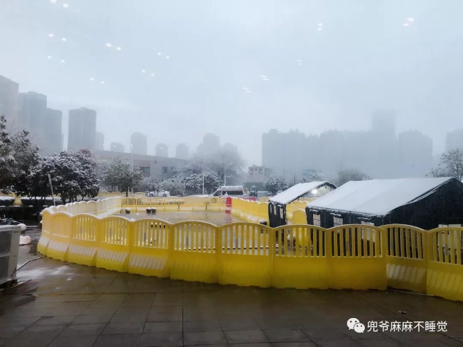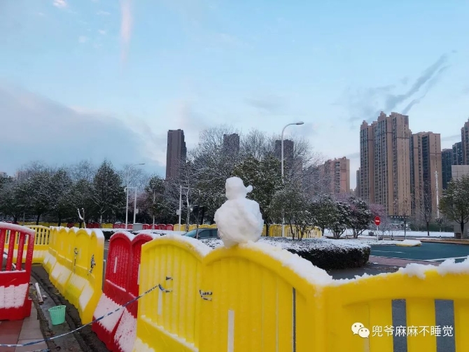 應(yīng)該是在方艙門口執(zhí)勤的工作人員,堆了個小雪人放在防護欄上,莫名覺得好可愛。