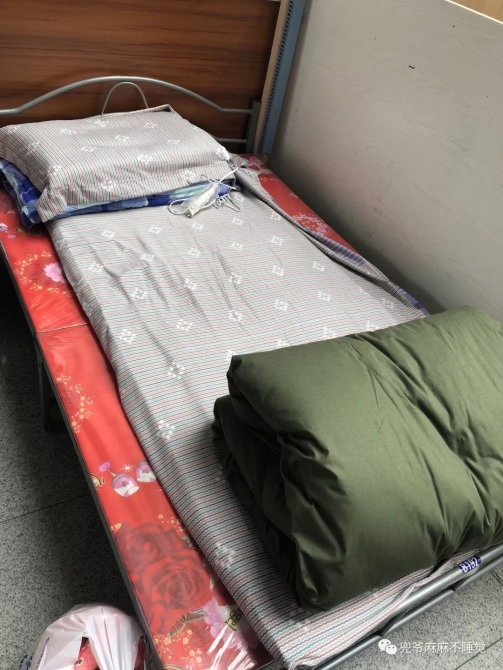 我登記完后進去跟著護士來到了我的床位,床上有電熱毯、枕頭、一床薄被子、一床厚被子。