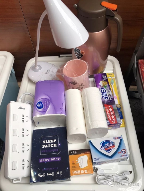擺開來看,有牙刷牙膏、水杯、卷紙、抽紙、香皂、接線板、保溫壺、充電器、眼罩耳塞、小臺燈、拖鞋、毛巾、盆子,一共10多件。