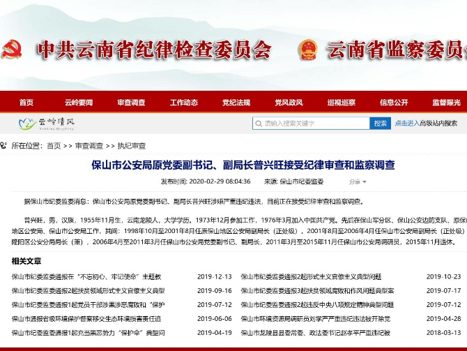 昆明信息港訊 機器人小明 據(jù)保山市紀委監(jiān)委消息:保山市公安局原黨委副書記、副局長普興旺涉嫌嚴重違紀違法,目前正在接受紀律審查和監(jiān)察調查。