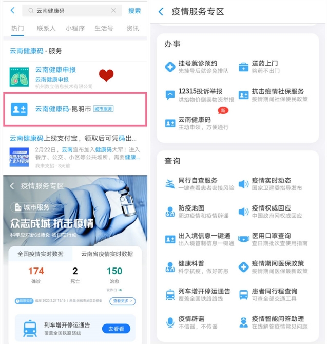 此外,小編還注意到,除了健康碼,云南人還可以在支付寶—城市服務(wù)欄目中獲取其他疫情服務(wù),包括查詢疫情動態(tài)、在線問診、送藥上門、在線查社保、醫(yī)用口罩查詢等。