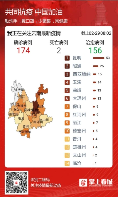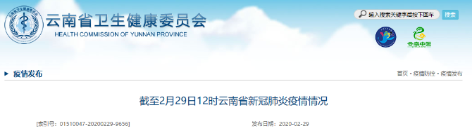 2月29日0時至12時,無新增確診病例,新增治愈出院病例1例(大理州)。截至2月29日12時,全省累計確診病例174例,治愈出院157例,死亡2例,現(xiàn)有確診病例15例,無重癥、危重癥病例?,F(xiàn)有疑似病例8例。