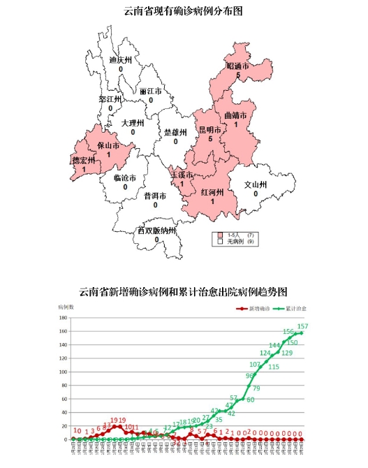 各州市累計(jì)確診病例:昆明市53例(治愈出院48例),昭通市25例(治愈出院20例),西雙版納州15例(治愈出院14例、死亡1例),玉溪市14例(治愈出院12例、死亡1例),曲靖市13例(治愈出院12例),大理州13例(治愈出院13例),保山市9例(治愈出院8例),紅河州9例(治愈出院8例),麗江市7例(治愈出院7例),德宏州5例(治愈出院4例),普洱市4例(治愈出院4例),楚雄州4例(治愈出院4例),文山州2例(治愈出院2例),臨滄市1例(治愈出院1例)。