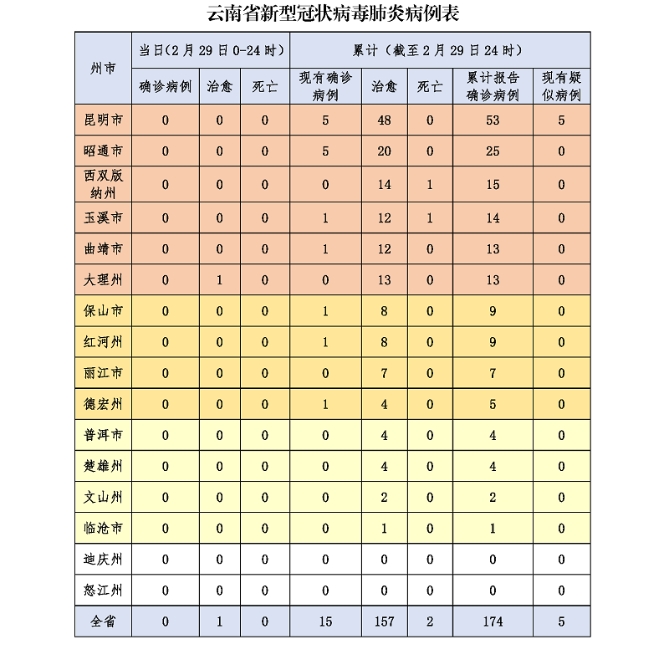 昆明信息港訊 機(jī)器人小明 2月29日12時(shí)至24時(shí),無新增確診病例。截至2月29日24時(shí),已連續(xù)9天新增病例為0,全省累計(jì)確診病例174例,治愈出院157例,死亡2例;現(xiàn)有確診病例15例,無重癥、危重癥病例;現(xiàn)有疑似病例5例。密切接觸者當(dāng)日解除醫(yī)學(xué)觀察39人,正在觀察118人。