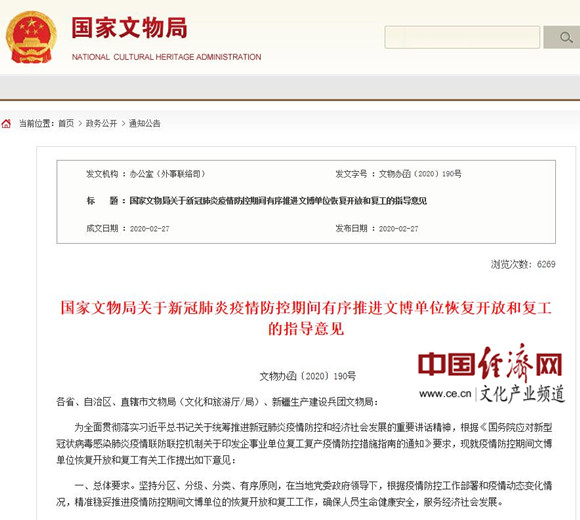 國家文物局關(guān)于新冠肺炎疫情防控期間有序推進(jìn)文博單位恢復(fù)開放和復(fù)工的指導(dǎo)意見