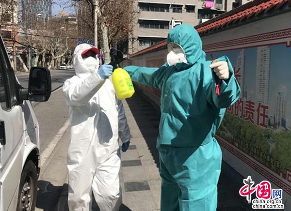 送完患者后,街道的工作人員為王禾田消毒。受訪者供圖