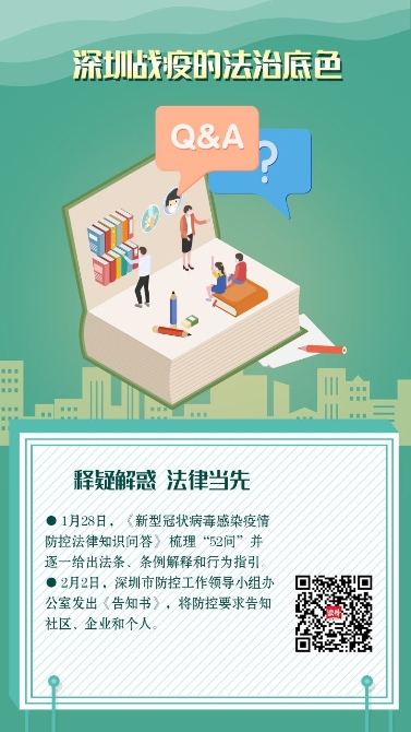 釋疑解惑,法律當(dāng)先。1月28日,深圳率先在全省編寫的《新型冠狀病毒感染疫情防控法律知識(shí)問答》亮相,梳理出疫情防治、政府管控、刑事責(zé)任、對勞動(dòng)關(guān)系的影響等方面的"52問",并逐一給出法條、條例解釋和行為指引。