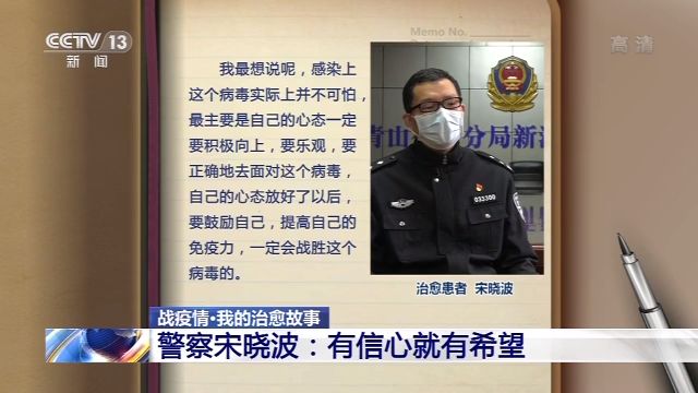 武漢市第九醫(yī)院護(hù)士:我覺得宋警官是一位很積極、樂觀的人,在他的臉上,你很少能看到消極的一面,他經(jīng)常說,信心是良藥,我們要用良藥來對抗疾病。他們一個病房里的三個人,實(shí)際上病情也不輕,有一個老哥還很重,但是最后恢復(fù)的情況還不錯,住了十天多一點(diǎn)吧,他們就先后出院了。