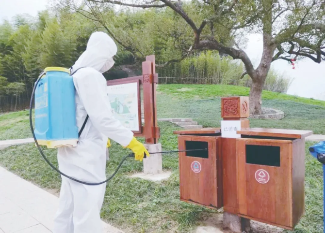 工作人員對良渚古城遺址公園內(nèi)進(jìn)行全面消殺不留死角,確保觀眾健康安全參觀