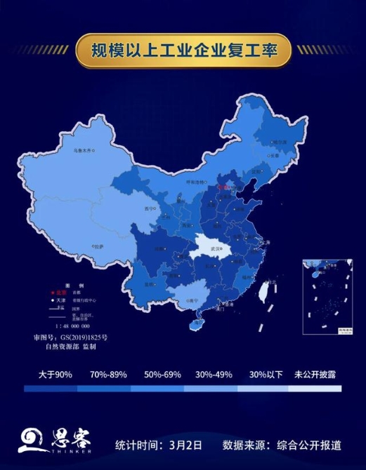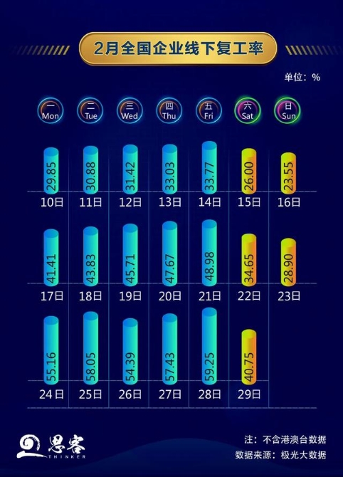 經濟發(fā)展“動起來”,2月10日以來,全國企業(yè)線下復工率平均每周提升10%。思客聯合極光大數據,對約10億條人口遷徙數據進行分析,結果顯示全國企業(yè)總體復工率由復工第一周的30%,上升至第三周的50%以上。