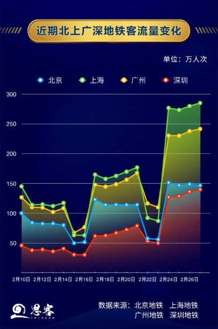 北上廣深地鐵客流量呈階梯式增長,四座城市正在錯峰、有序復工。2月10日以來,北上廣深四城工作日地鐵客流量與周末客流量有明顯差距,每周客流人數較上周均有所增多,其中周一形成了人流“小高峰”。雖受遠程辦公、地鐵限流、暫停尾號限行等影響,客流量與春節(jié)前相比仍有差距,但可以預測,四座城市的地鐵客流量將隨著復工率的提升逐漸增多。
