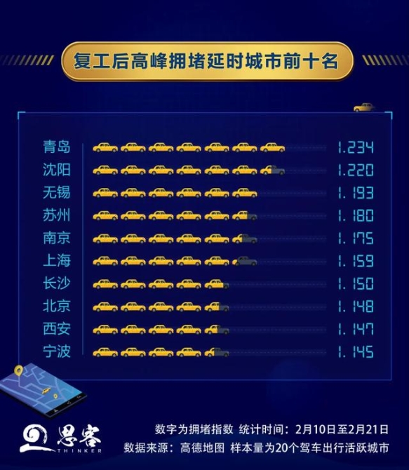 城市又開始奔跑,部分大城市擁堵趨勢開始回升。復工的人流穿梭在城市中,隨之而來的是車流增多、道路變“紅”,青島、沈陽、無錫、蘇州、南京等地的民眾已經開始體驗復工堵車的“煩惱”,“第一次看到堵車會開心”還登上了微博熱搜,有網民說“久違的堵車讓我看到城市在復蘇。”