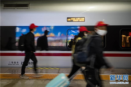 外出務(wù)工人員在昆明南站上車(2月24日攝)。新華社記者 胡超 攝