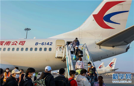在昆明長(zhǎng)水國(guó)際機(jī)場(chǎng),100余名務(wù)工人員乘坐東航包機(jī)前往山東煙臺(tái)返崗復(fù)工(2月26日攝)。 新華社發(fā)(葉勤茹 攝)