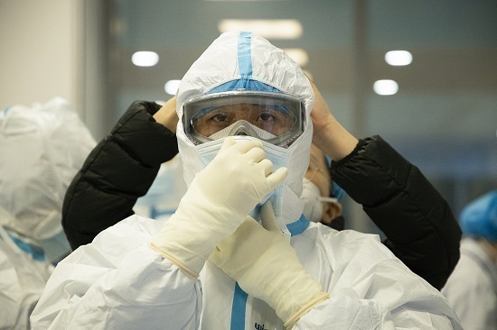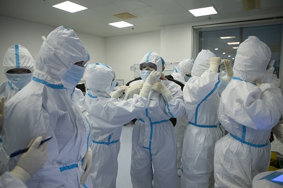 2月27日,同濟光谷醫(yī)院E1二樓病區(qū),廣州中山三院隊員準備進倉。