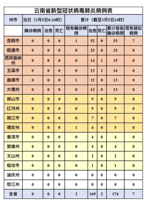 據(jù)云南省衛(wèi)生健康委員會(huì)消息,3月5日12時(shí)至24時(shí),無新增確診病例。截至3月5日24時(shí),已連續(xù)14天新增病例為0,全省累計(jì)確診病例174例,治愈出院169例,死亡2例,現(xiàn)有確診病例3例,無重癥、危重癥病例。現(xiàn)有疑似病例7例。密切接觸者當(dāng)日解除醫(yī)學(xué)觀察7人,正在觀察74人。