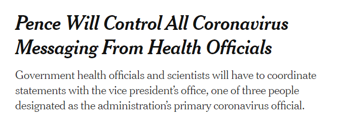 據《紐約時報》報道,美國總統(tǒng)特朗普2月26日就疫情召開新聞發(fā)布會時,任命彭斯負責抗擊新冠肺炎工作。而彭斯新官上任“首把火”,就是防止白宮和專家傳遞混淆矛盾的信息。工作小組中的美國國家過敏和傳染病研究所主任法奇(Anthony Fauci)告訴其同事,他已經受到白宮指令,未來任何對外聲明都需要得到白宮批準?!都~約時報》則直接在標題上稱:彭斯將對衛(wèi)生官員發(fā)布的新冠病毒信息進行“控制”。