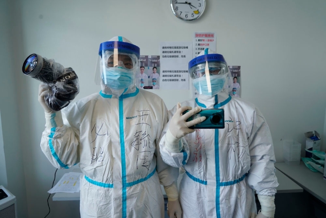 2月18日,新華社記者王毓國(左)和許楊在武漢同濟(jì)醫(yī)院中法院區(qū)重癥隔離病區(qū)采訪。新華社發(fā)