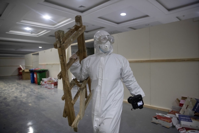 2月5日,新華社記者熊琦在江漢方艙醫(yī)院內(nèi)采訪。新華社發(fā)