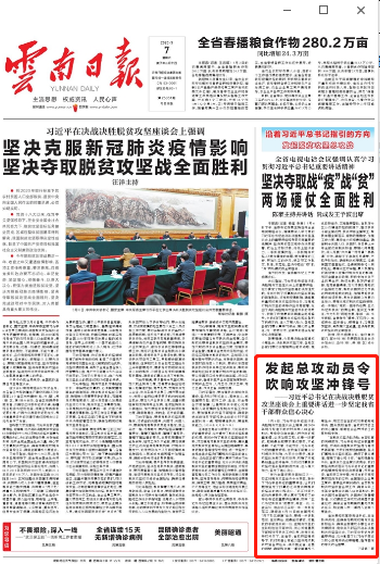 “在脫貧攻堅決戰(zhàn)決勝、全面收官的關(guān)鍵時刻,習(xí)近平總書記發(fā)表重要講話,對決戰(zhàn)決勝脫貧攻堅進(jìn)行再動員再部署,為我們克服當(dāng)前困難、堅決打贏脫貧攻堅收官戰(zhàn),提供了根本遵循,增強了信心和斗志?!笔≌泵貢L、省扶貧辦主任黃云波表示,我們要堅決貫徹落實習(xí)近平總書記重要講話精神和黨中央決策部署,按照省委、省政府工作安排,針對當(dāng)前云南疫情可控向好的態(tài)勢,全面推動企業(yè)復(fù)工復(fù)產(chǎn)、春耕生產(chǎn)順利進(jìn)行,全面抓好脫貧攻堅收官各項工作,確保今年上半年全省剩余貧困人口全部脫貧、剩余貧困村全面出列、貧困縣達(dá)到摘帽標(biāo)準(zhǔn),以過硬的工作成效迎接國家普查驗收,確保全省如期高質(zhì)量完成脫貧任務(wù),和全國人民一道進(jìn)入全面小康社會。