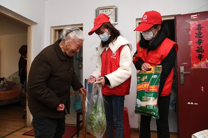2020年3月5日,“00后”志愿者王束佳(中)和同伴為行動(dòng)不便的老人送去蔬菜、大米。記者 劉軍喜 攝